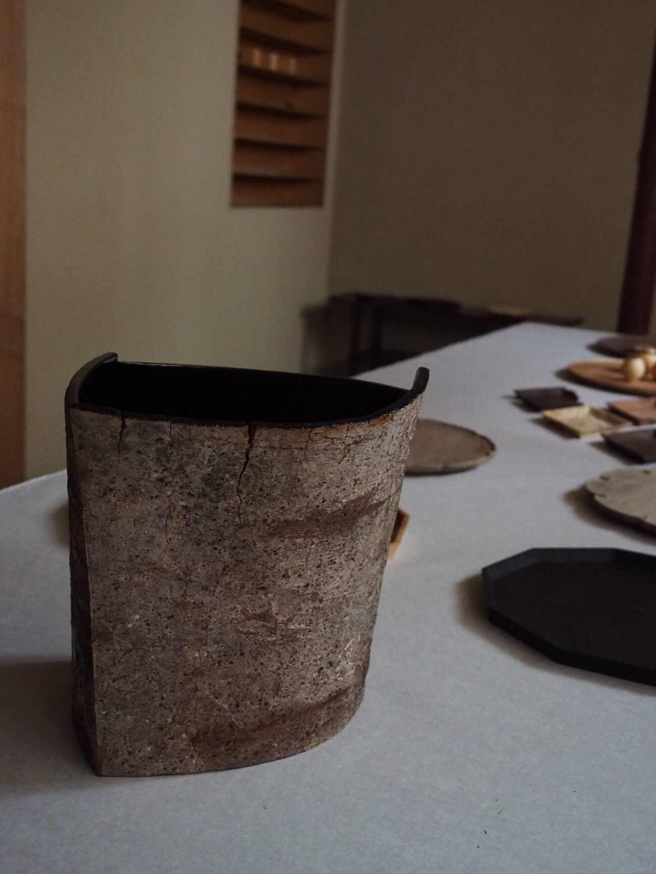 今回のDM作品は、ケヤキの木肌を巻き取って制作したワインクーラーです。瓢箪で作られた茶器や花器も新作で届きました。